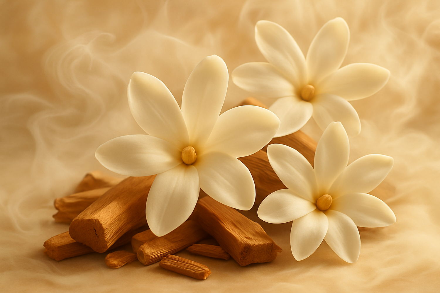 In the base, the creamy warmth of tiare flower, soft musk, and smooth sandalwood leaves a gentle, lingering impression.