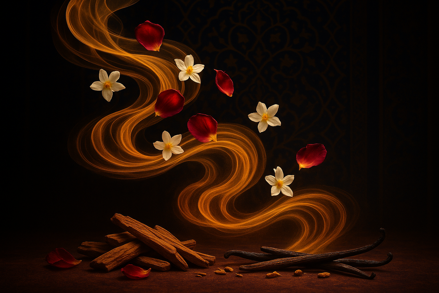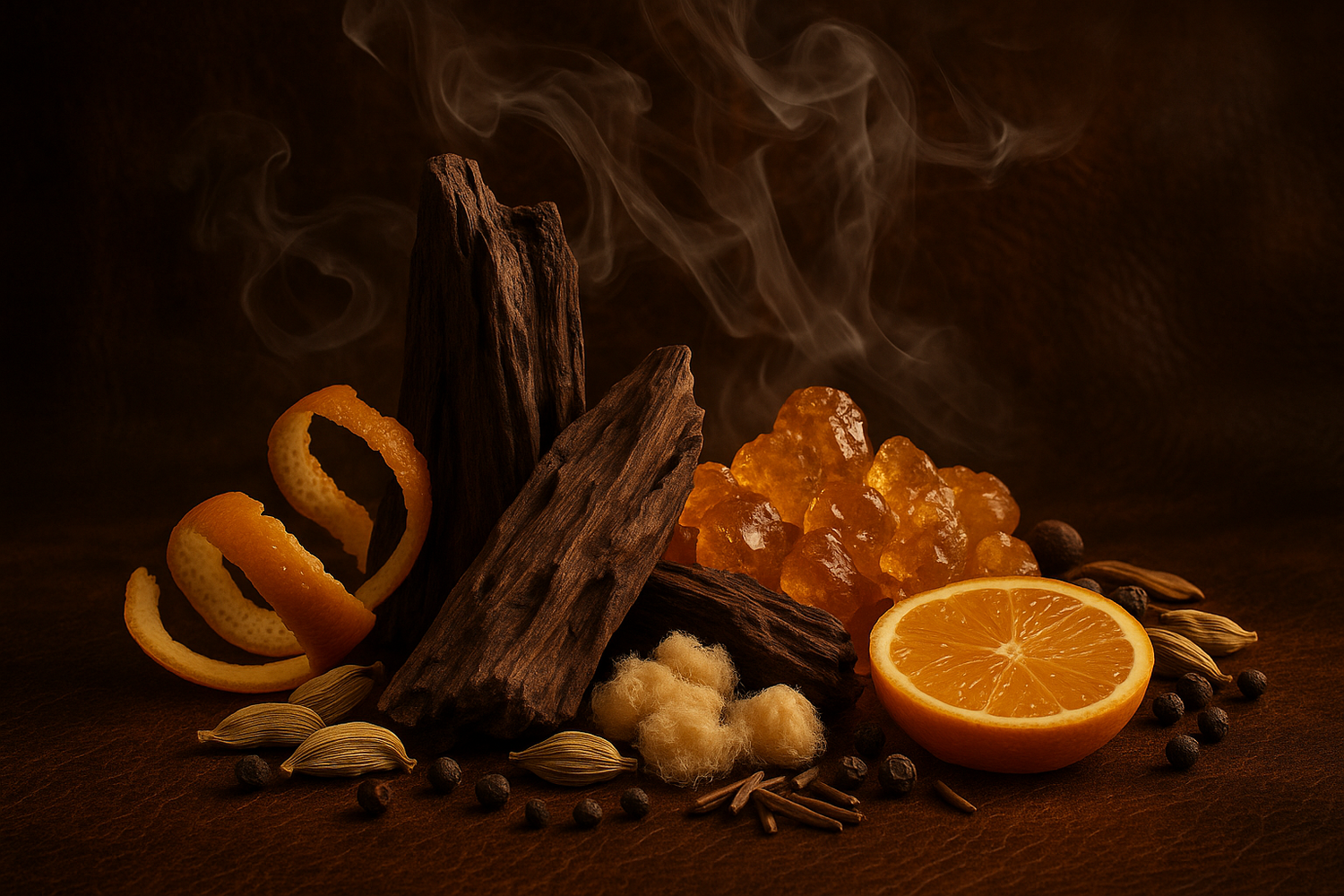The base notes of oud, musk, and ambery accords provide a rich and sensual foundation, resulting in a complex and alluring scent that combines freshness, spice, and sweetness with a hint of leathery richness.